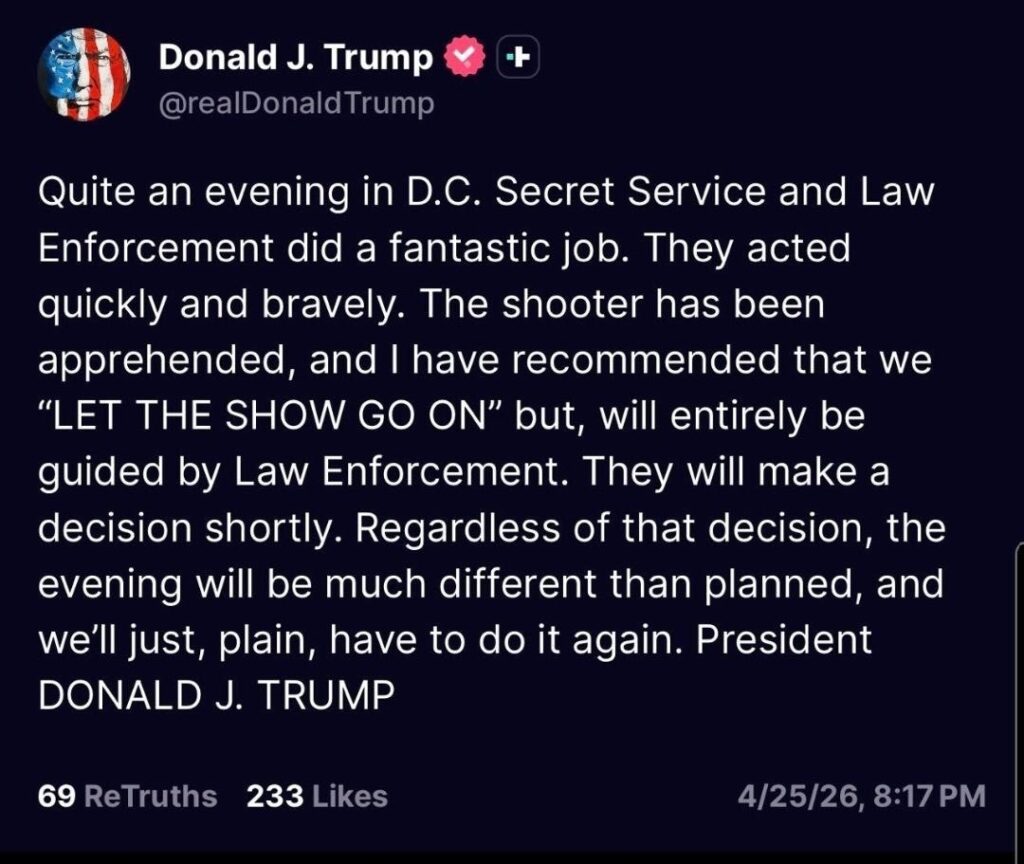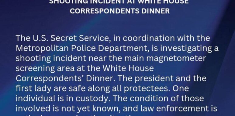 Video zeigt einen Agenten, der nach Schüssen auf dem Boden liegt, bei dem Weißen Haus-Korrespondenten-Dinner der White House Correspondents’ Association (WHCA) im Washington Hilton. Laut verfügbaren Informationen wurden während der Veranstaltung Schüsse gehört, woraufhin das Sicherheitspersonal rasch reagierte und die Gäste evakuiert wurden. Der Verdächtige wurde festgenommen, und die Umstände des Vorfalls werden noch untersucht.